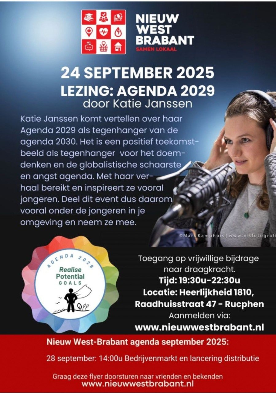 Op 24 september komt Katie Janssen vertellen over haar Agenda 2029 als tegenhanger van de agenda 2030. Het is een positief toekomstbeeld als tegenhanger voor het doemdenken en de globalistische schaarste en angst agenda.